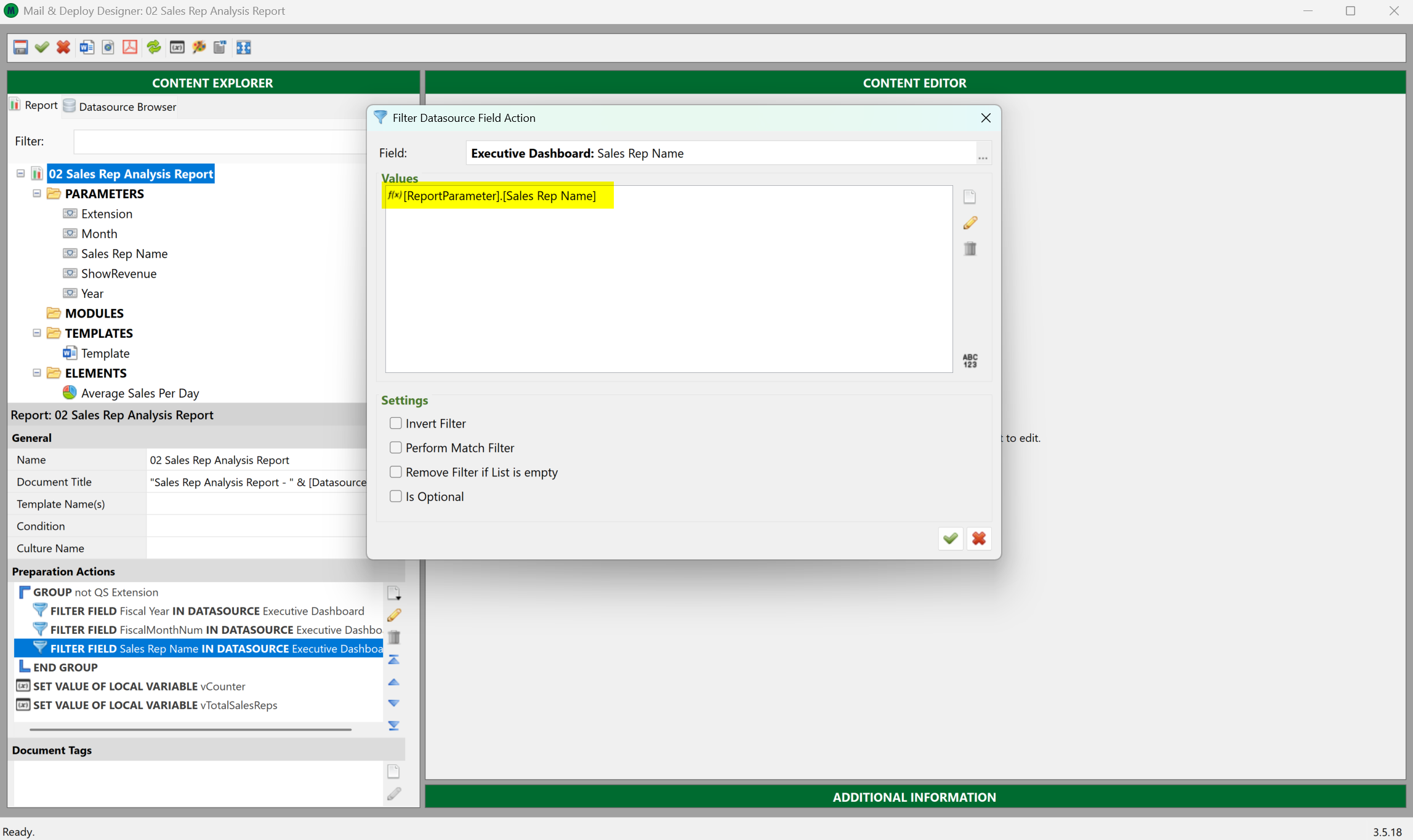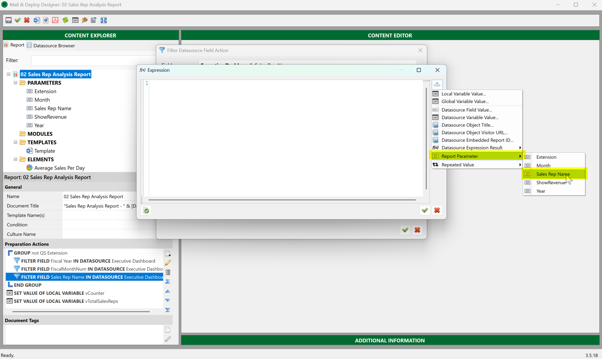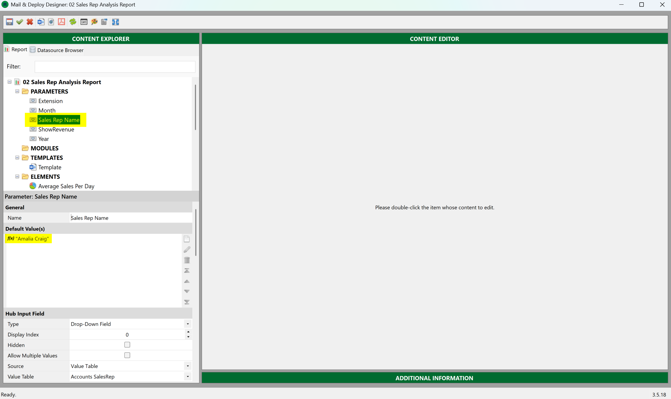 For example, "Amalia Craig" will be used as the default value, then during the design phase, the report will be generated for the Sales Rep Name "Amalia Craig".