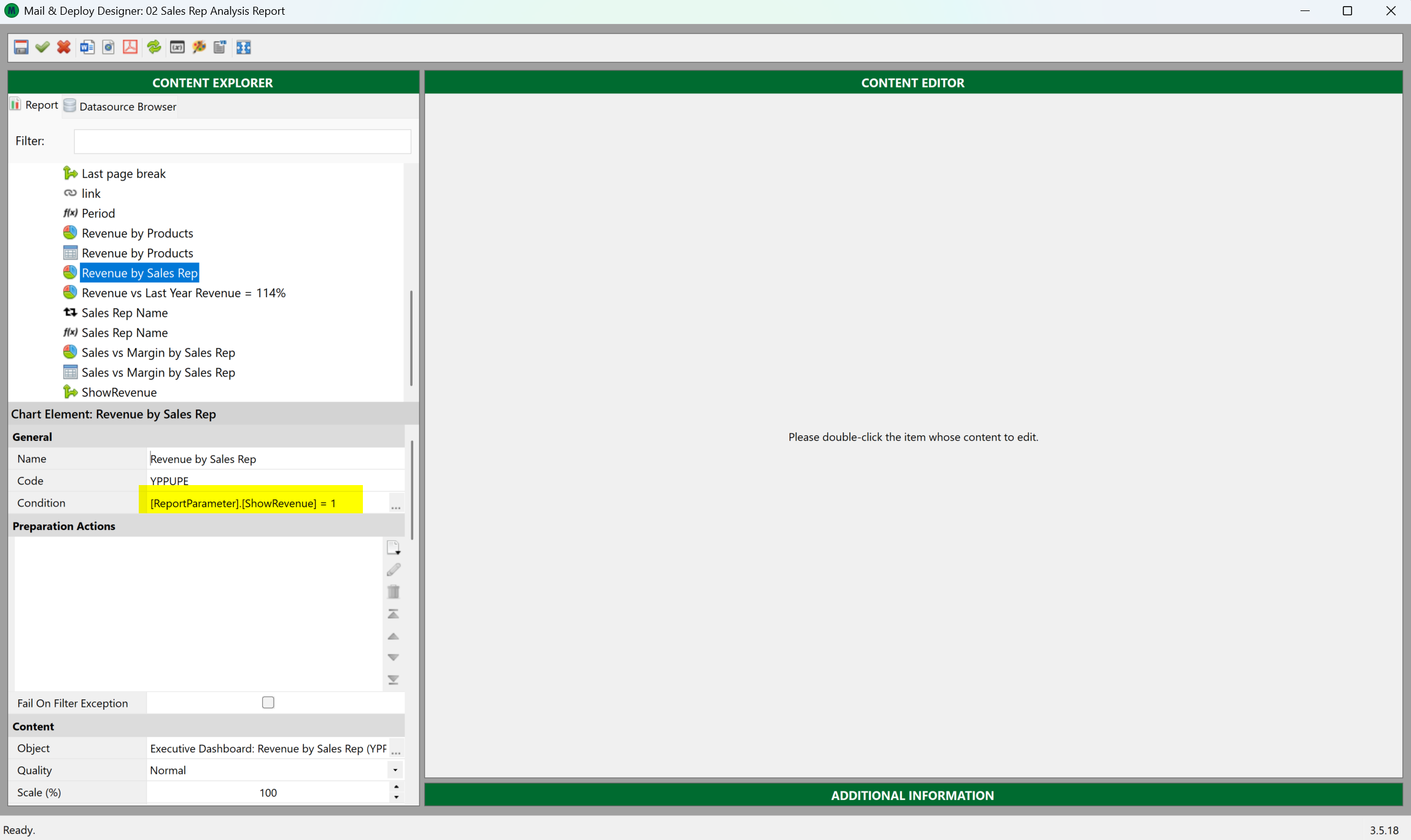 For example, Show Revenue which will be used in the Condition property of Elements to show/hide them in the Report.