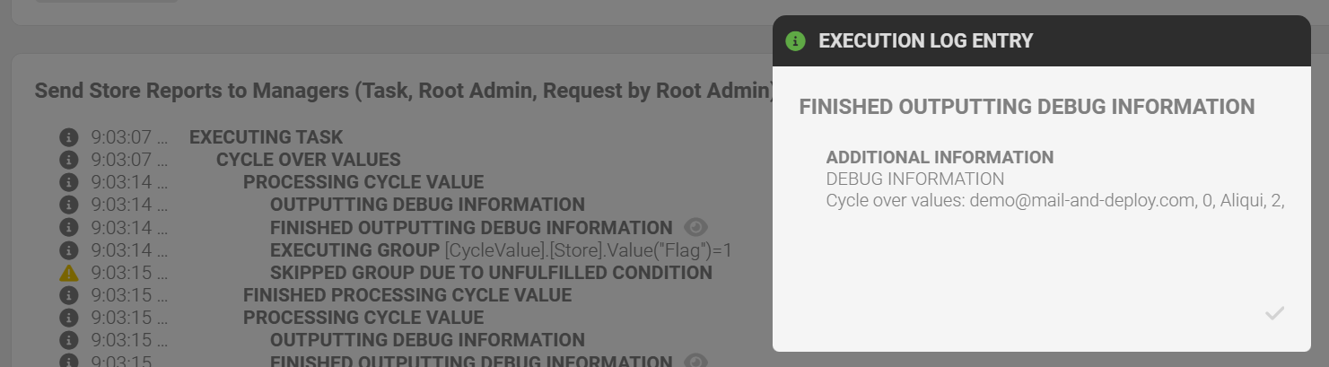This action is just for debugging purpose. The expression ToCsv() will display the whole row separating the fields value with a comma. The execution log will display something like this: