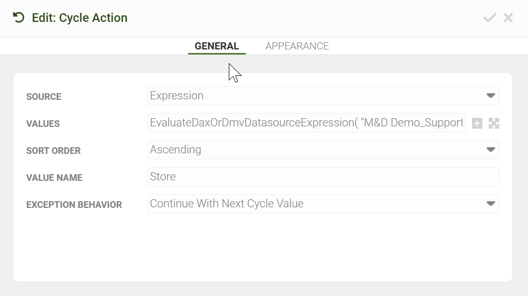 "Cycle over values: " & [CycleValue].[Store].Value.ToCsv()