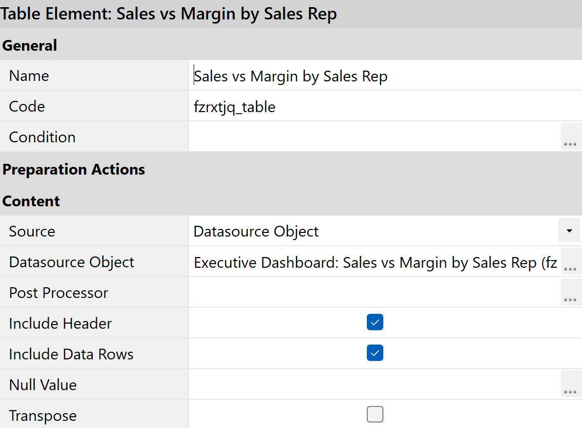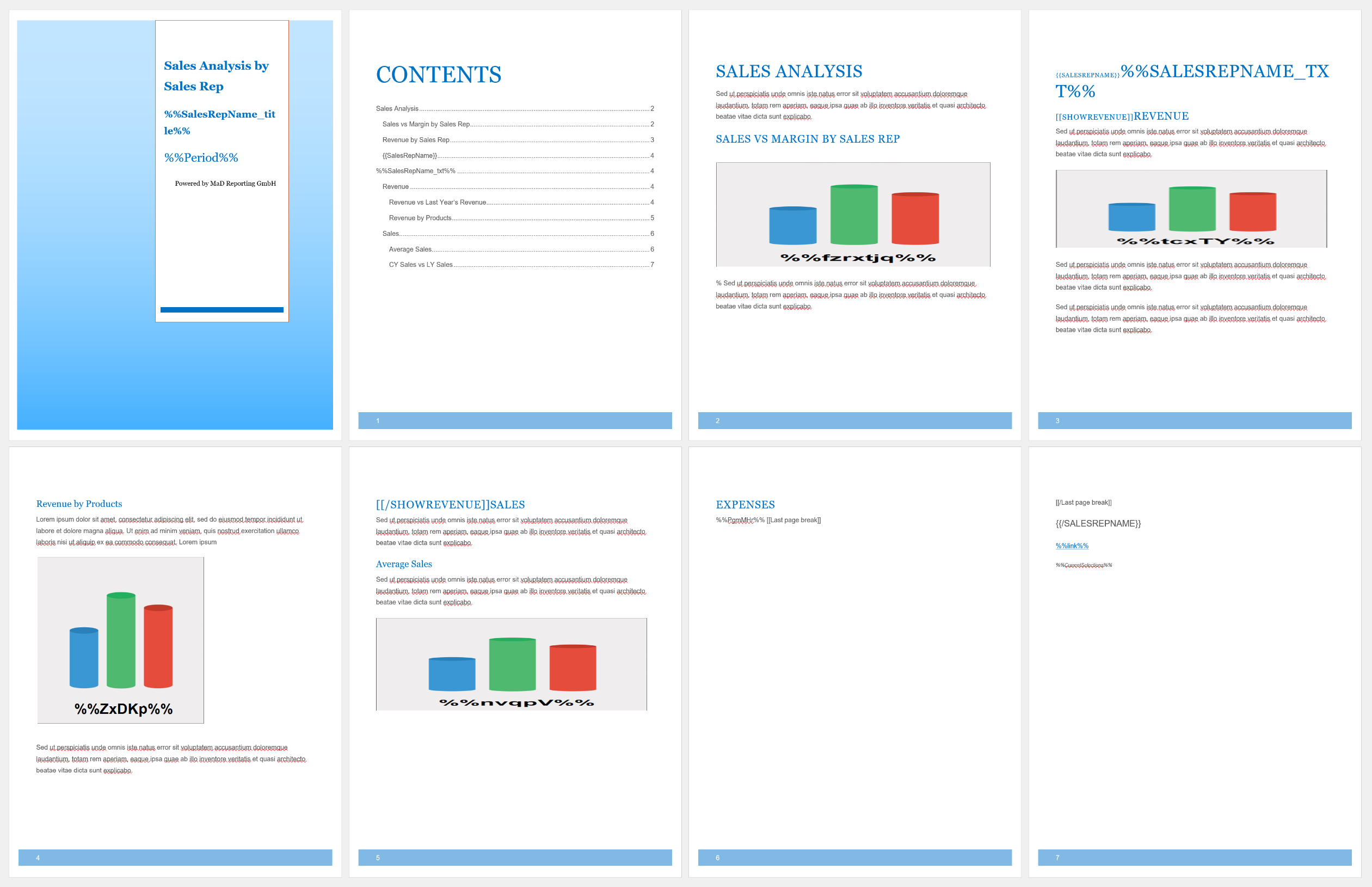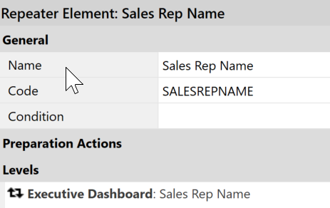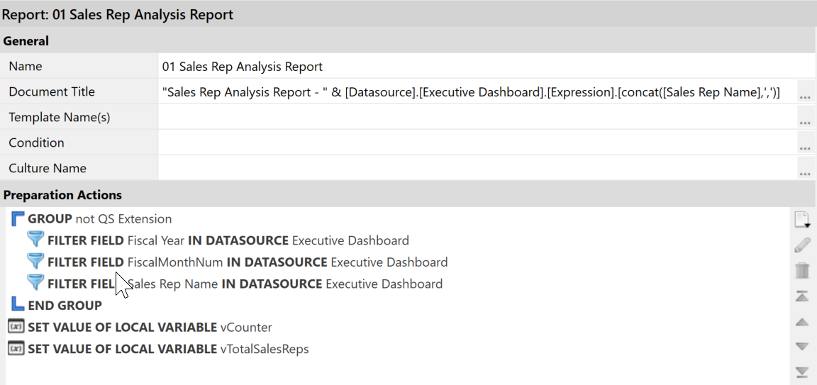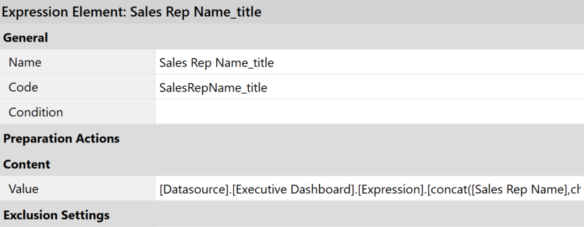 Document Title: "Sales Rep Analysis Report - " & [Datasource].[Executive Dashboard].[Expression].[concat([Sales Rep Name],',')]