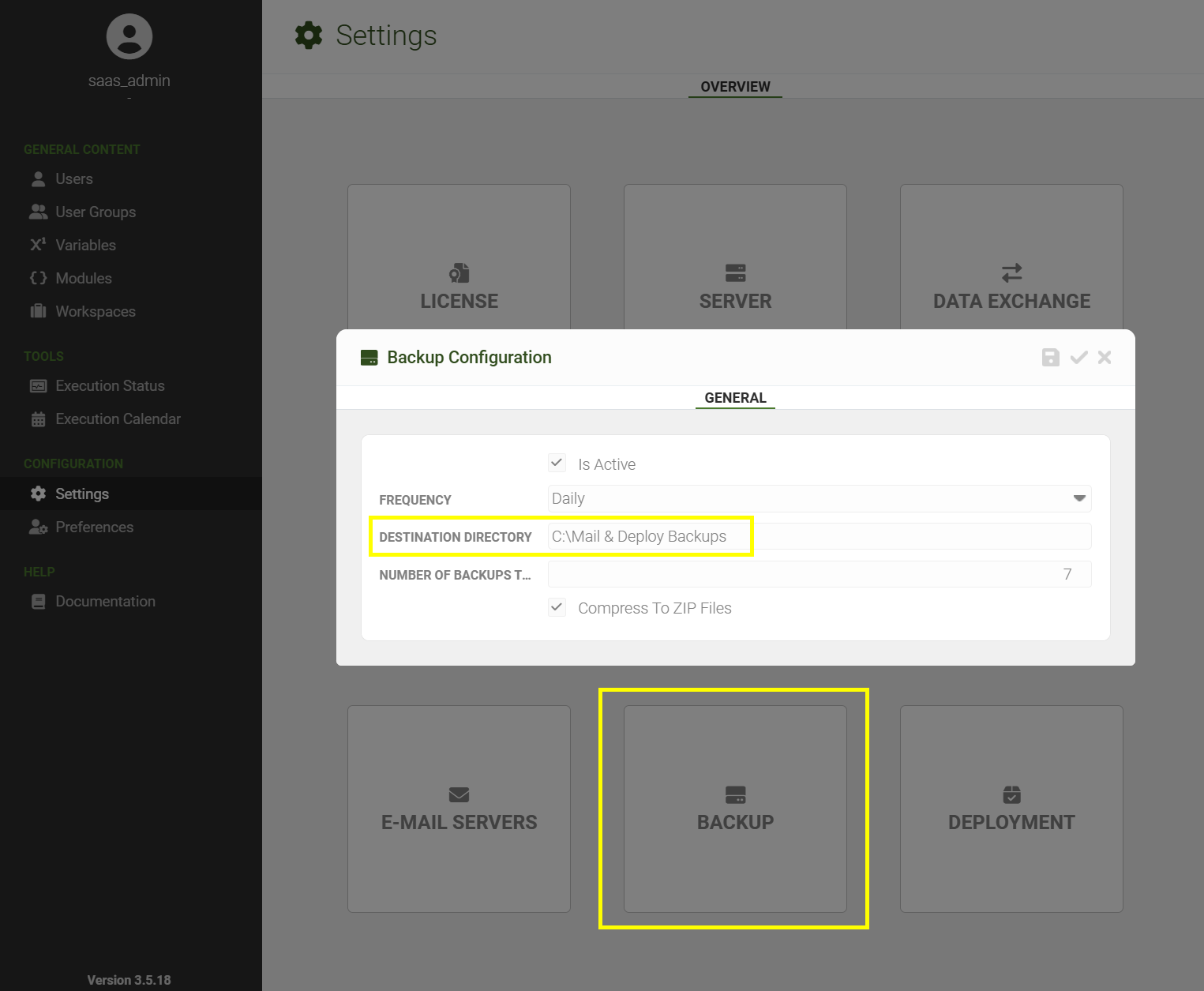 General The backup functionality can be used to create regular, automatic backups of the Repository database. Configuring Backup Settings To configure backup settings you have to connect to the Management Console of Mail & Deploy, click the Settings ...