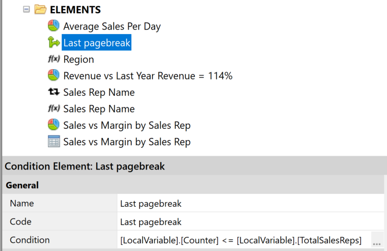 The total number of Sales Reps is needed in the Condition Element, it will be compared to the Counter to show or hide the page break.