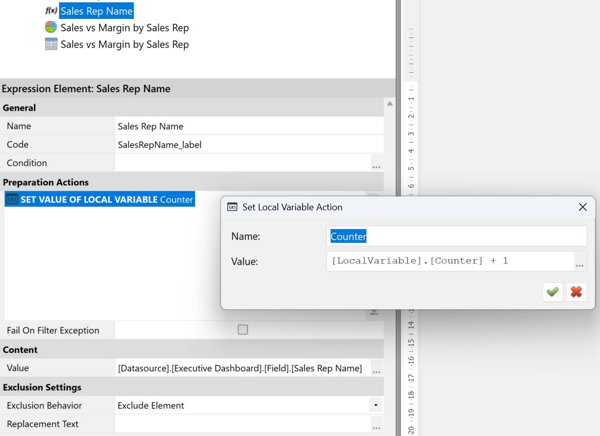 The Counter is increased by 1 in the preparation actions of the Sales Rep Name Expression Element that is displayed.