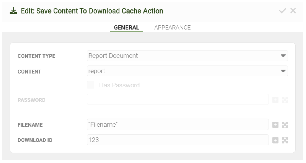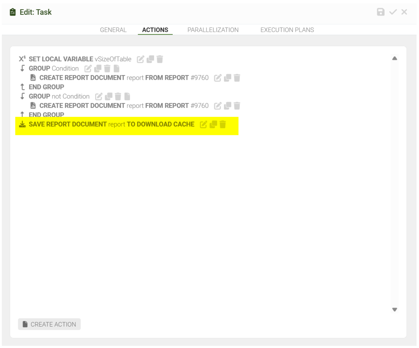 In the following example, the Task is called using the API. In the Task, depending on a Condition, this could be the size of a Table, one or another Report will be created. Then using the Save Report Document To Download Cache will be used to save the Report in Memory, which can be afterwards retrieved using the ID specified in the Action.
