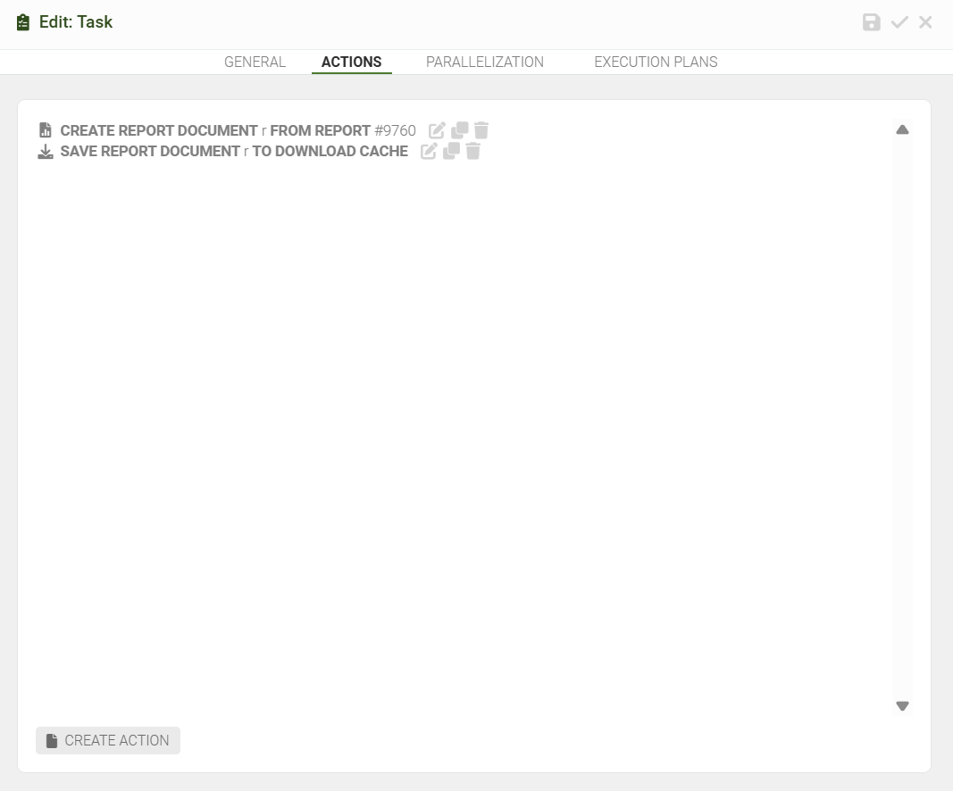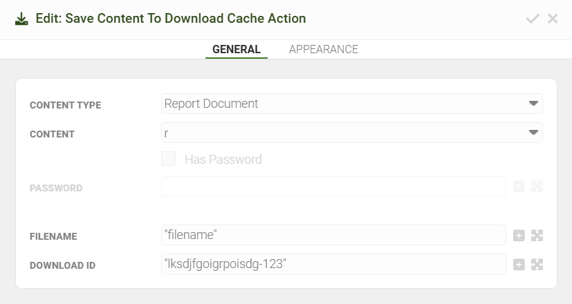 Save Report Document To Download Cache Action is used to save the Report in Memory, which can be afterwards retrieved using the ID specified in the Action.