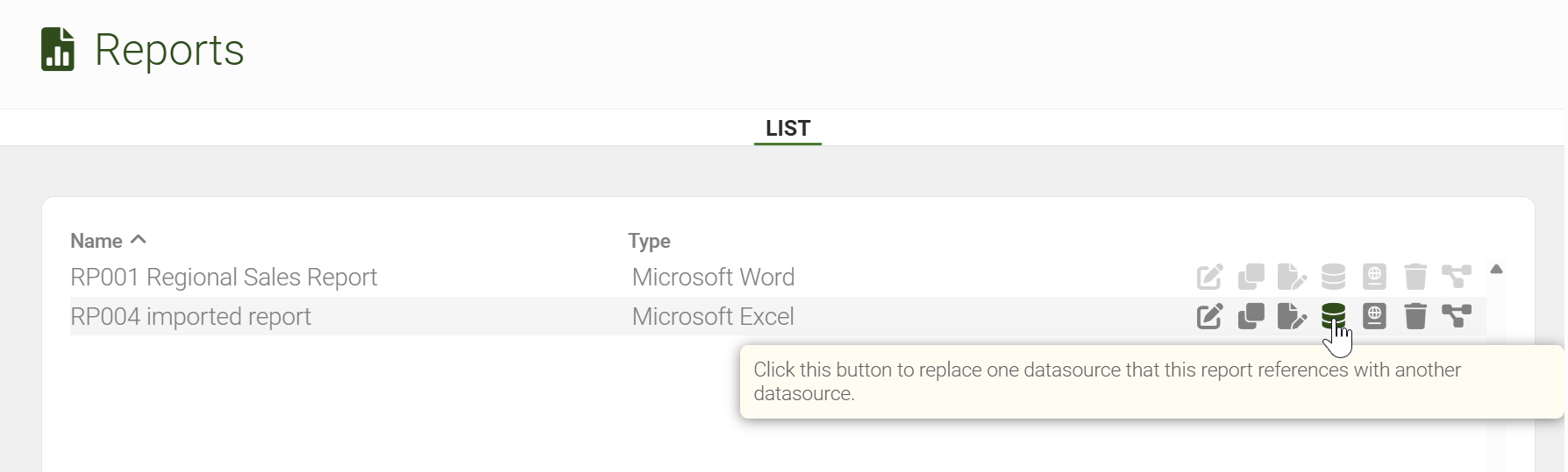 To replace the datasource used in a Report, use the following option: